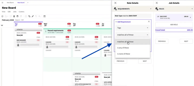 From the first dropdown, select the Requirement Type (Skills, Tags, Labels, etc.).
